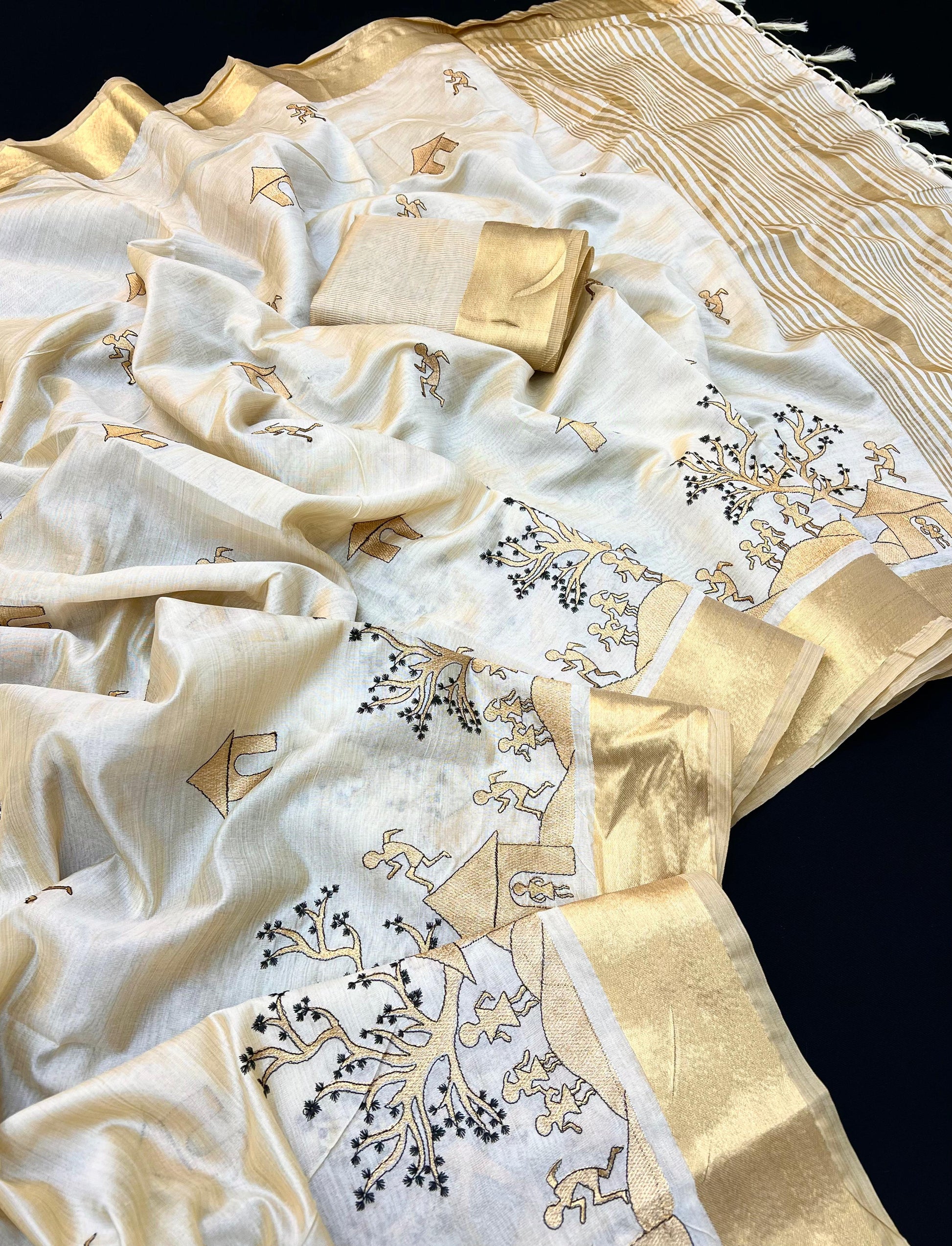 Experience the charm of rural India with this exquisite cream tusser silk saree featuring authentic Warli tribal art depicting village life. This stunning piece captures the essence of traditional community living through intricate hand-embroidered scenes that tell stories of harmony between humans and nature.