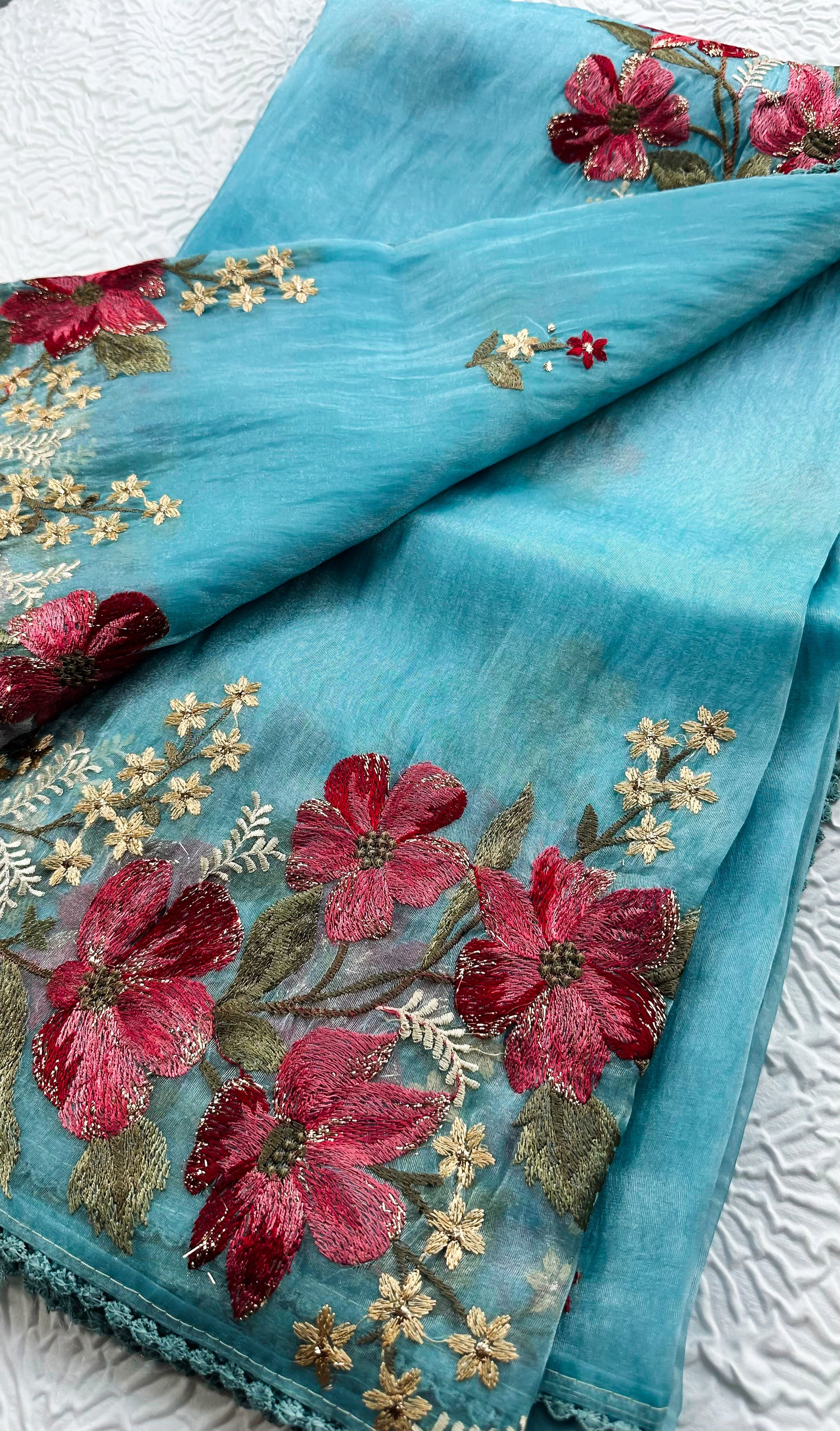 The lightweight, semi-sheer fabric catches the light beautifully, giving the saree a subtle shimmer and flowy elegance. Rich red and golden threadwork florals cascade across the soft teal base, while intricate detailing along the edges adds a graceful touch.