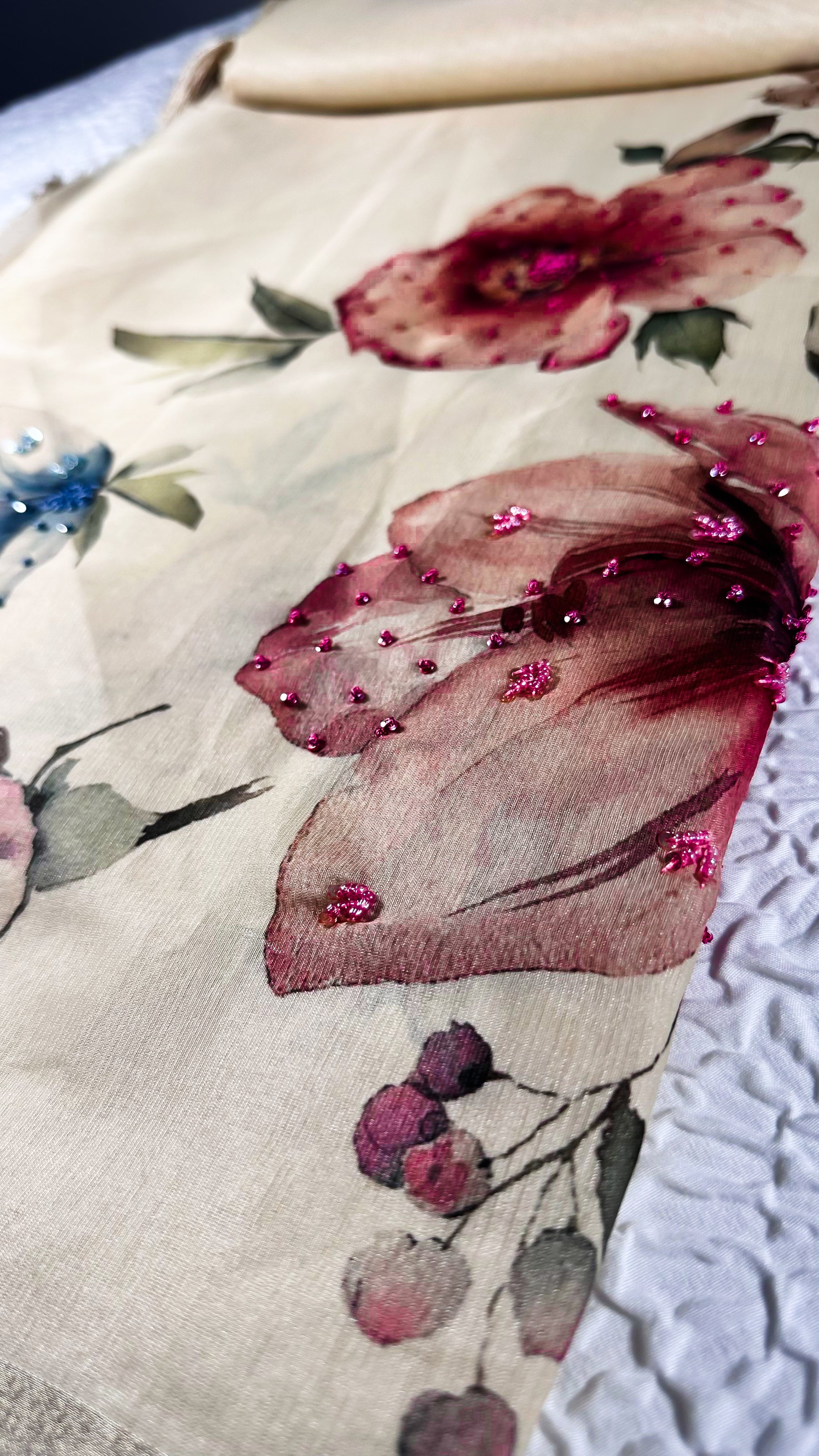 Breathe elegance into your ethnic wardrobe with this soft organza saree, exquisitely adorned with Malti Resham embroidery — delicate, multicolored threadwork that adds a vibrant, handcrafted charm.