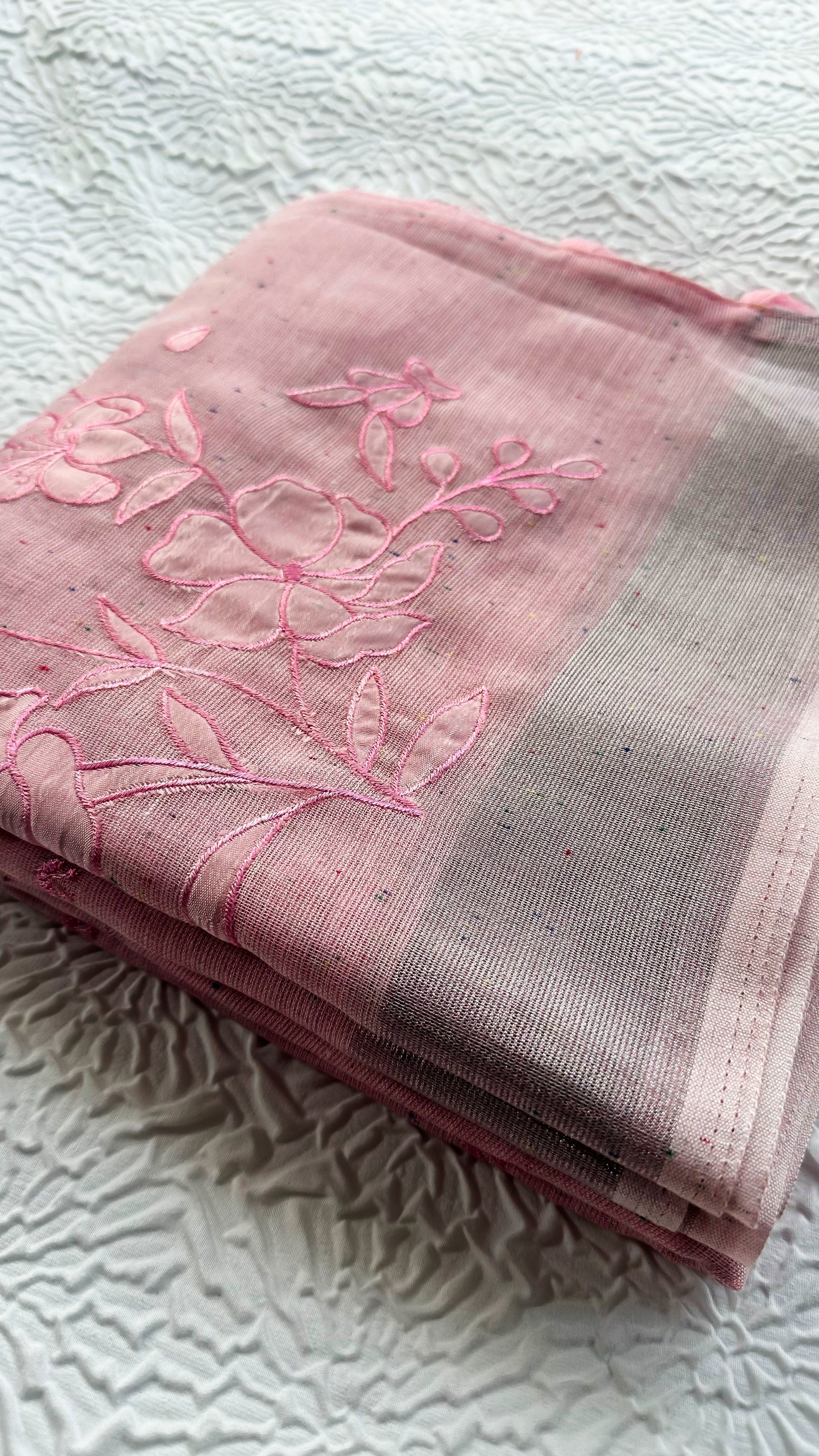 Soft Pink Linen Saree with Floral Appliqué Work & Tassel Detailing