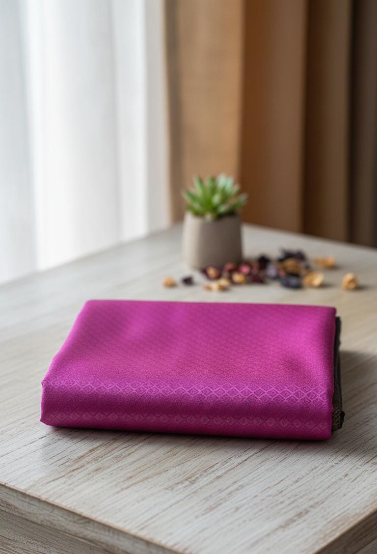 The Vasundhara Kubera Silk Saree is a striking blend of vibrancy and subtle contrast. The saree features a luminous magenta body woven with fine geometric textures, beautifully balanced by a sophisticated ash-grey pallu highlighted with elegant teal traditional motifs.